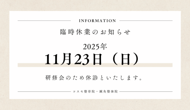 11月23日(日)は研修会のため休診といたします。 2025.11.16 休診のお知らせ 【臨時休診のお知らせ】 11月23日(日)は研修会のため休診といたします。 ご不便をおかけしますが、何卒よろしくお願いいたします。 秋のEMSダイエット割引月間始めました! 前の記事